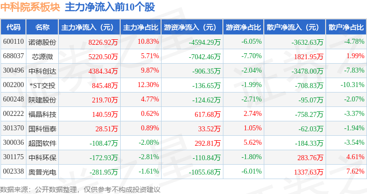 从资金流向上来看,当日中科院系板块主力资金净流出1.39亿元,游资资金净流出1.78亿元,散户资金净流入3.17亿元。中科院系板块个股资金流向见下表:
