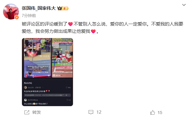 面对网友的暖心鼓励,他再次发文回应:被评论区的评论暖到了,不管别人怎么说,爱你的人一定爱你。不爱我的人我要爱他,我会努力做出成果让他爱我。