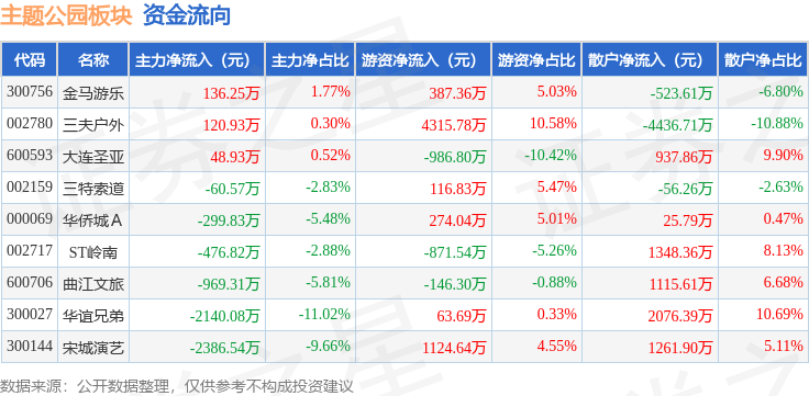 从资金流向上来看,当日主题公园板块主力资金净流出6027.03万元,游资资金净流入4277.7万元,散户资金净流入1749.32万元。主题公园板块个股资金流向见下表: