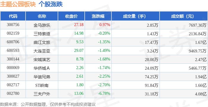 本站消息,6月18日主题公园板块较上一交易日下跌1.73%,三夫户外领跌。当日上证指数报收于3388.81,上涨0.04%。深证成指报收于10175.59排名前10的证券公司,上涨0.24%。主题公园板块个股涨跌见下表: